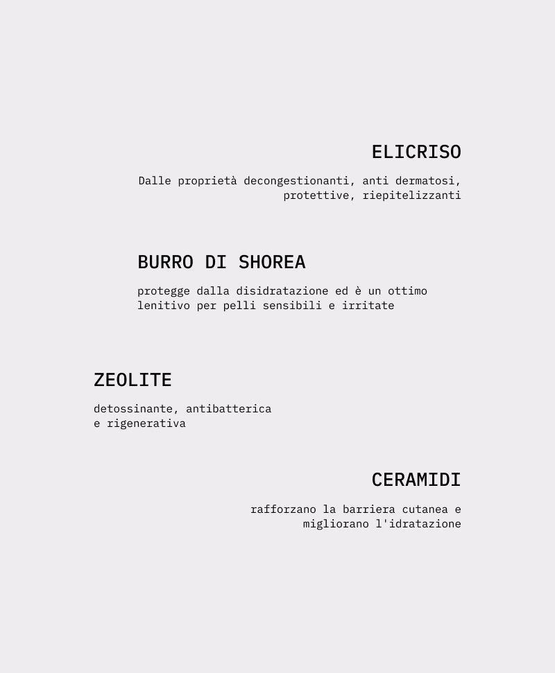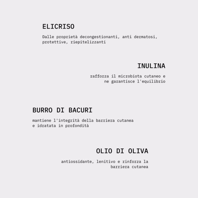 È priva di ingredienti sensibilizzanti come alcol, parabeni e allergeni, nel rispetto delle pelli più sensibili.