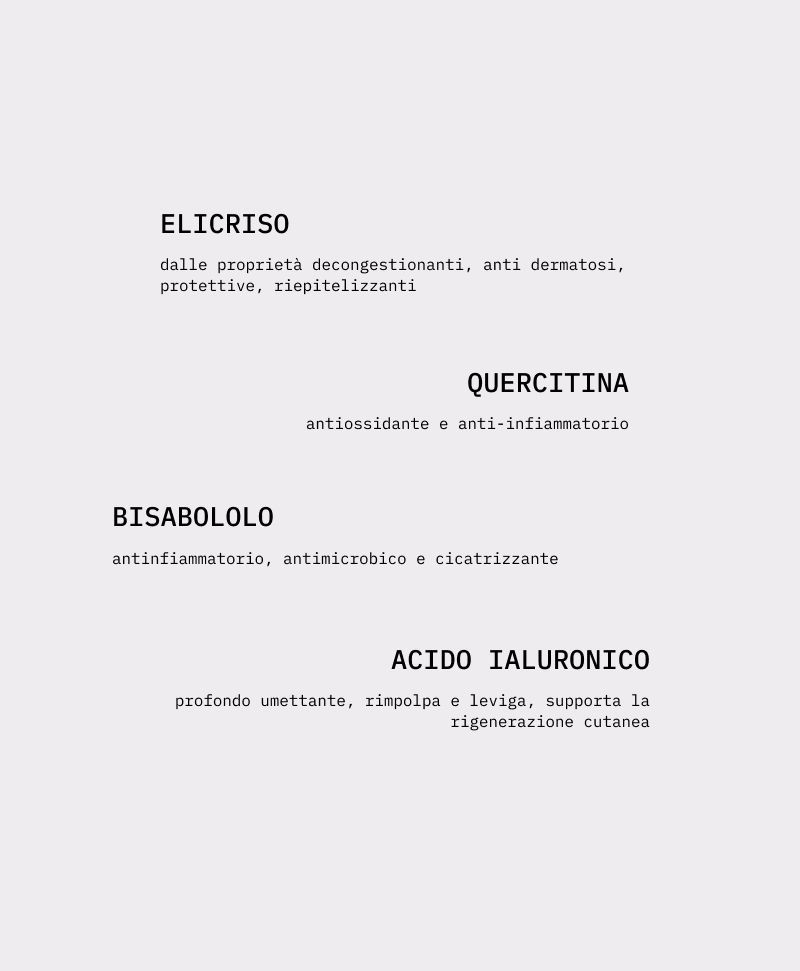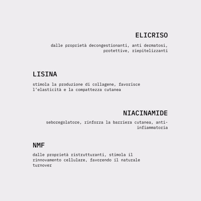 - Liquirizia Esosomica: attivo upcycled, potenzia l’assorbimento degli ingredienti funzionali. Ha proprietà antinfiammatorie, antiossidanti e calmanti.